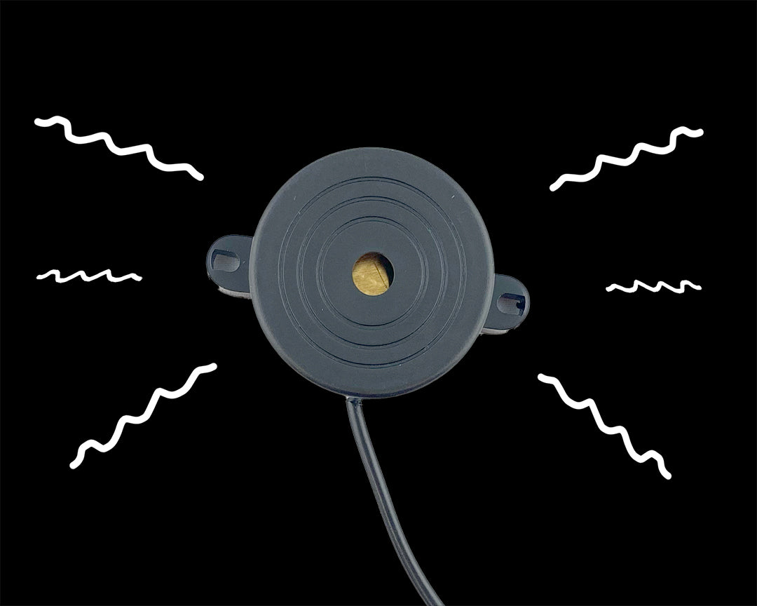 AWARE comes with an optional buzzer in the box. The buzzer provides audible feedback by increasing the frequency of beeps the closer you are to an object.